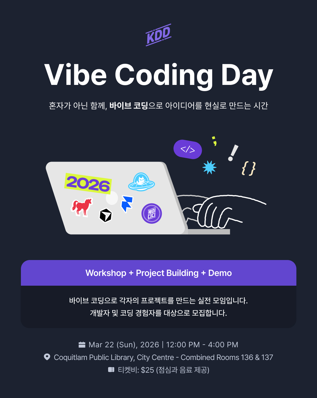 이번 Vibe Coding Day는 Foodly와 KOrder를 운영 중인 Eric Kim 개발자님의 실전 인사이트 세션을 시작으로, 각자의 프로젝트를 바이브 코딩, 그리고 데모 발표까지 이어지는 실전 빌딩 데이입니다.